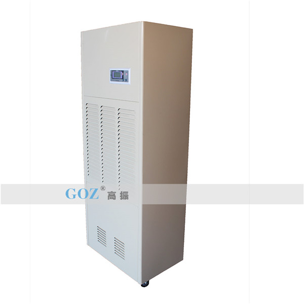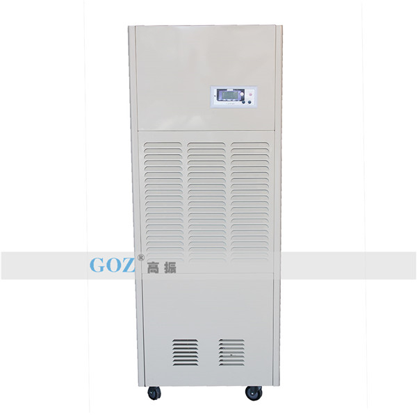 高振商用除濕機(jī)通過(guò)風(fēng)機(jī)將潮濕空氣抽入機(jī)器內(nèi)部,通過(guò)壓縮機(jī)制冷將蒸發(fā)器降溫至露點(diǎn)以下,潮濕空氣經(jīng)過(guò)蒸發(fā)器在表面凝結(jié)成水,匯集至接水盤(pán)后,流入水箱中,干爽空氣經(jīng)冷凝器重新加熱由出風(fēng)口排出,這樣不斷循環(huán)將室內(nèi)濕度降低。