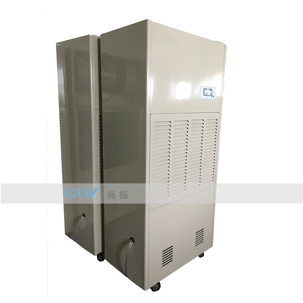 高振商用除濕機(jī)通過風(fēng)機(jī)將潮濕空氣抽入機(jī)器內(nèi)部,通過壓縮機(jī)制冷將蒸發(fā)器降溫至露點(diǎn)以下,潮濕空氣經(jīng)過蒸發(fā)器在表面凝結(jié)成水,匯集至接水盤后,流入水箱中,干爽空氣經(jīng)冷凝器重新加熱由出風(fēng)口排出,這樣不斷循環(huán)將室內(nèi)濕度降低。